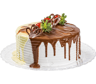 Massa branca molhadinha, um recheio de leite ninho com pedaços de chocolate branco e outro de trufa preta, coberto com chantilly, ganache branco e preto e morangos ou cerejas.